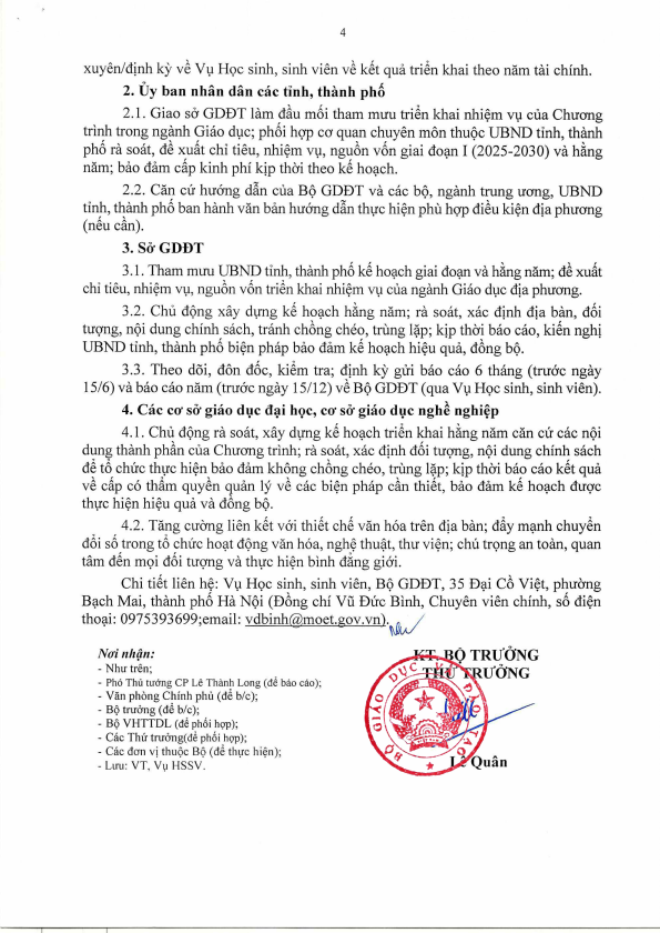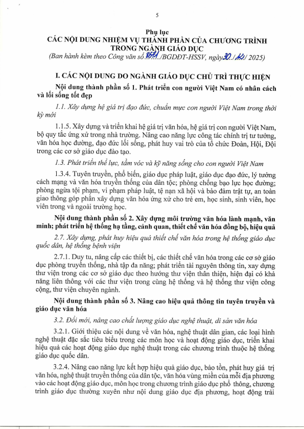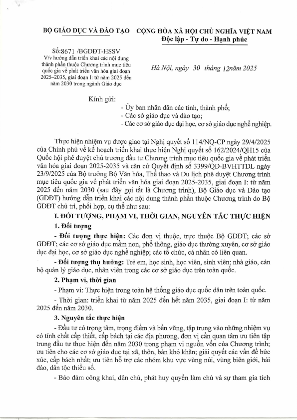 Hướng dẫn triển khai các nội dung thành phần thuộc Chương trình mục tiêu quốc gia về phát triển văn hóa giai đoạn 2025 - 2035, giai đoạn I: từ năm 2025 đến năm 2030 trong ngành Giáo dục