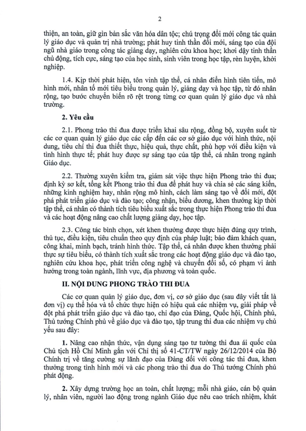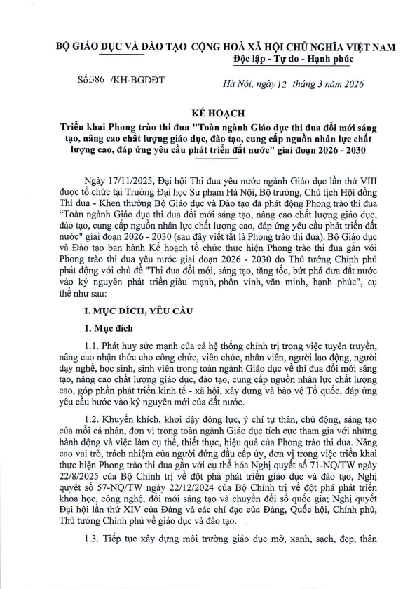 Kế hoạch Triển khai Phong trào thi đua ’’Toàn ngành Giáo dục thi đua đổi mới sáng tạo, nâng cao chất lượng giáo dục, đào tạo, cung cấp nguồn nhân lực chất lượng cao, đáp ứng yêu cầu phát triển đất nước” giai đoạn 2026 - 2030