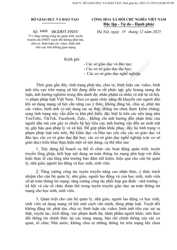 Tăng cường công tác quán triệt, tuyên truyền học sinh, sinh viên tuyệt đối không phát tán, chia sẻ, bình luận các video, hình ảnh tiêu cực trên không gian mạng