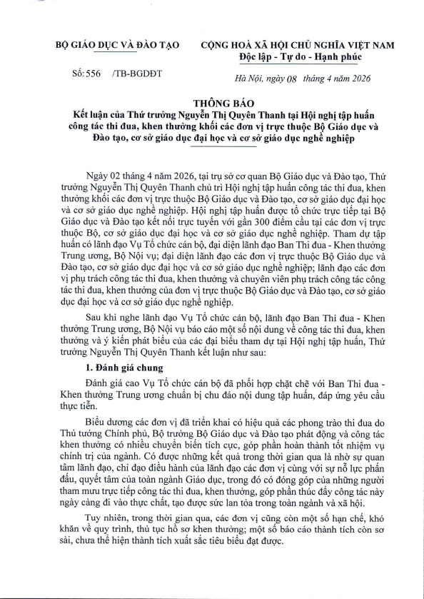 Thông báo Kết luận của Thứ trưởng Nguyễn Thị Quyên Thanh tại Hội nghị tập huấn công tác thi đua, khen thưởng khối các đơn vị trực thuộc Bộ Giáo dục và Đào tạo, cơ sở giáo dục đại học và cơ sở giáo dục nghề nghiệp