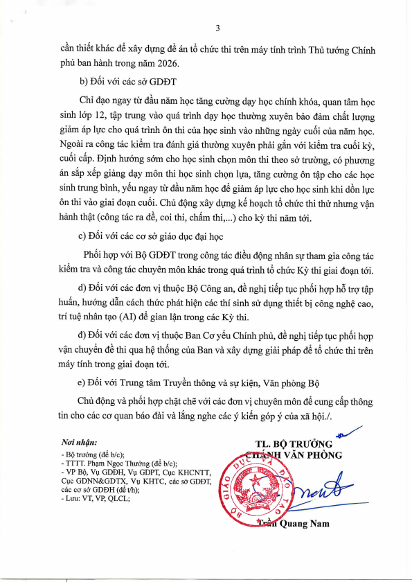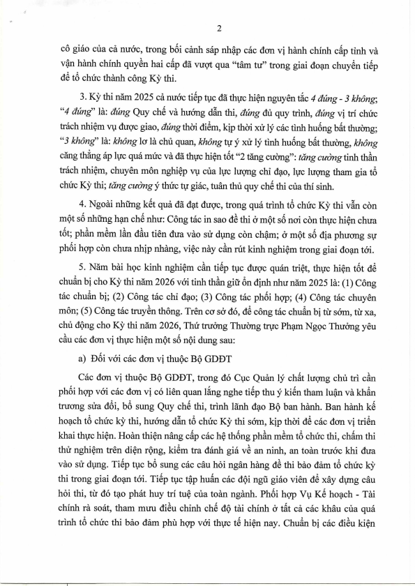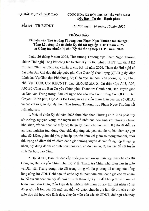 Thông báo kết luận của Thứ trưởng thường trực Phạm Ngọc Thưởng tại Hội nghị Tổng kết công tác tổ chức Kỳ thi tốt nghiệp THPT năm 2025 và Công tác chuẩn bị cho Kỳ thi tốt nghiệp THPT năm 2026
